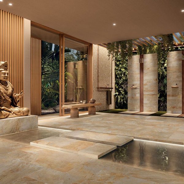 La pierre minérale Green Sukabumi est typique des paysages balinais. Son apparence raffinée et délicate évoque sans aucun doute l’île volcanique indonésienne, ses forêts luxuriantes et ses eaux transparentes. En la regardant de plus près, vous pourrez même distinguer les particularités de cette pierre naturelle à travers ses nuances de couleurs et ses irrégularités. Très charmante, l’authentique pierre de Bali reste toutefois relativement difficile d’accès, que ce soit en termes de rareté ou de prix. Cette pierre minérale est par ailleurs assez fragile et peut donc présenter quelques fissures sous le poids du temps. Si vous souhaitez tout de même profiter du charme de ce produit, sans ses inconvénients, sachez que Novoceram propose un carrelage en grès cérame imitation pierre de Bali. De très haute qualité, ce carrelage en grès cérame imite parfaitement l’authenticité de la Green Sukabumi, tout en étant plus solide que la pierre originale.