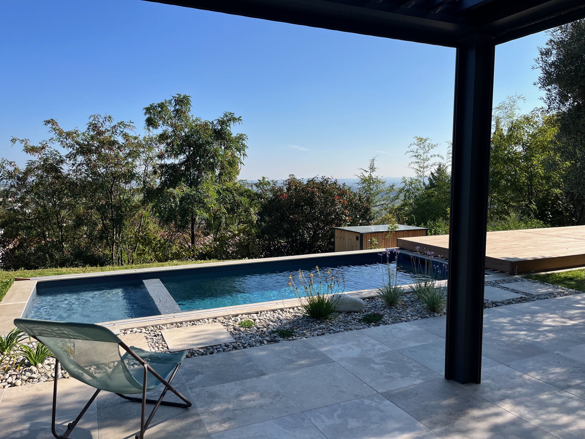 La terrasse, ombragée par une pergola bioclimatique, s’ouvre sur une piscine aux dimensions parfaitement adaptées à la vie familiale et à l’environnement paysager.