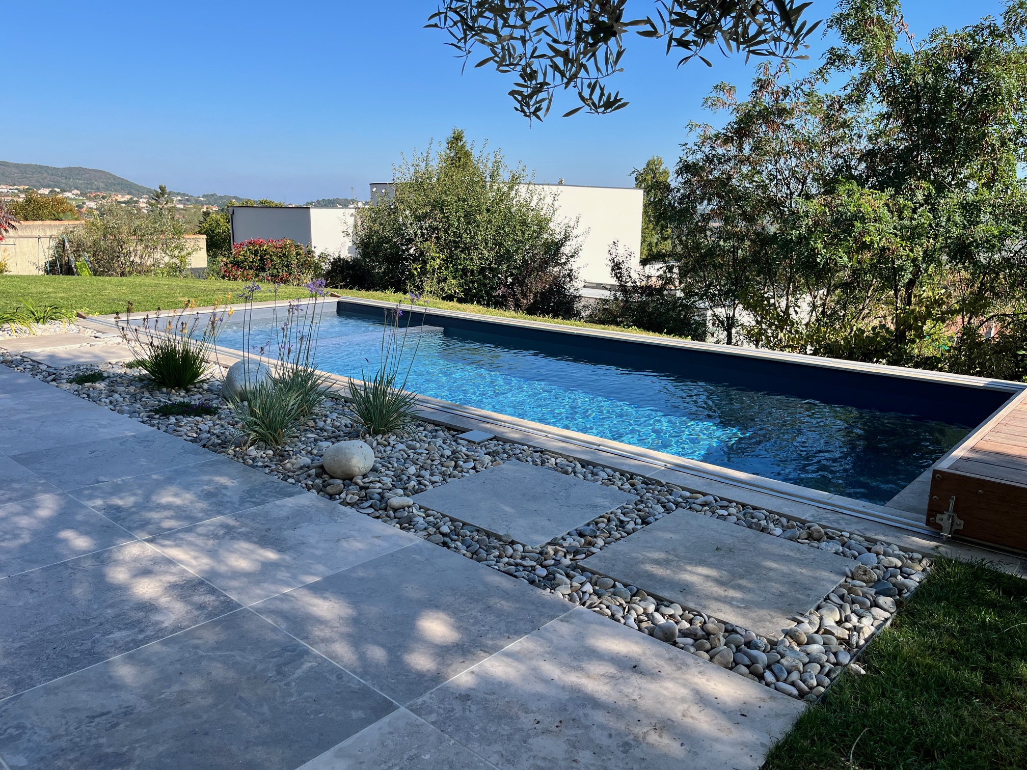 Pour compléter cet espace, une terrasse en bois sur rail a été intégrée : un choix à la fois esthétique et pratique, qui permet de couvrir le bassin en toute sécurité, sans rompre l’harmonie créée par Solithe.