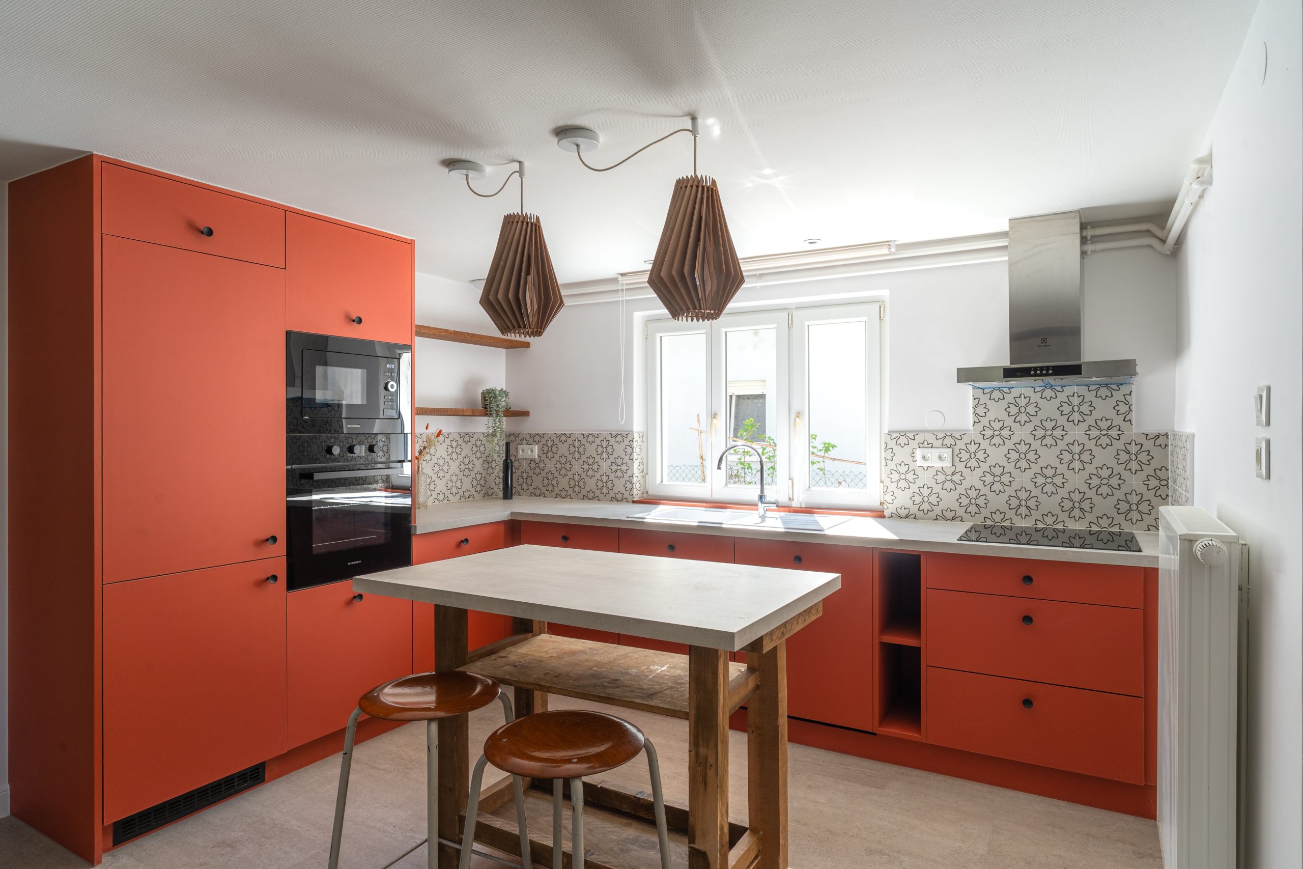 Les meubles de cuisine, dans une teinte orange vive, structurent l’espace et apportent une identité forte à l’ensemble. En crédence, la collection Bohème Flower de Novoceram introduit une dimension graphique et décorative, en écho à cette approche expressive.
