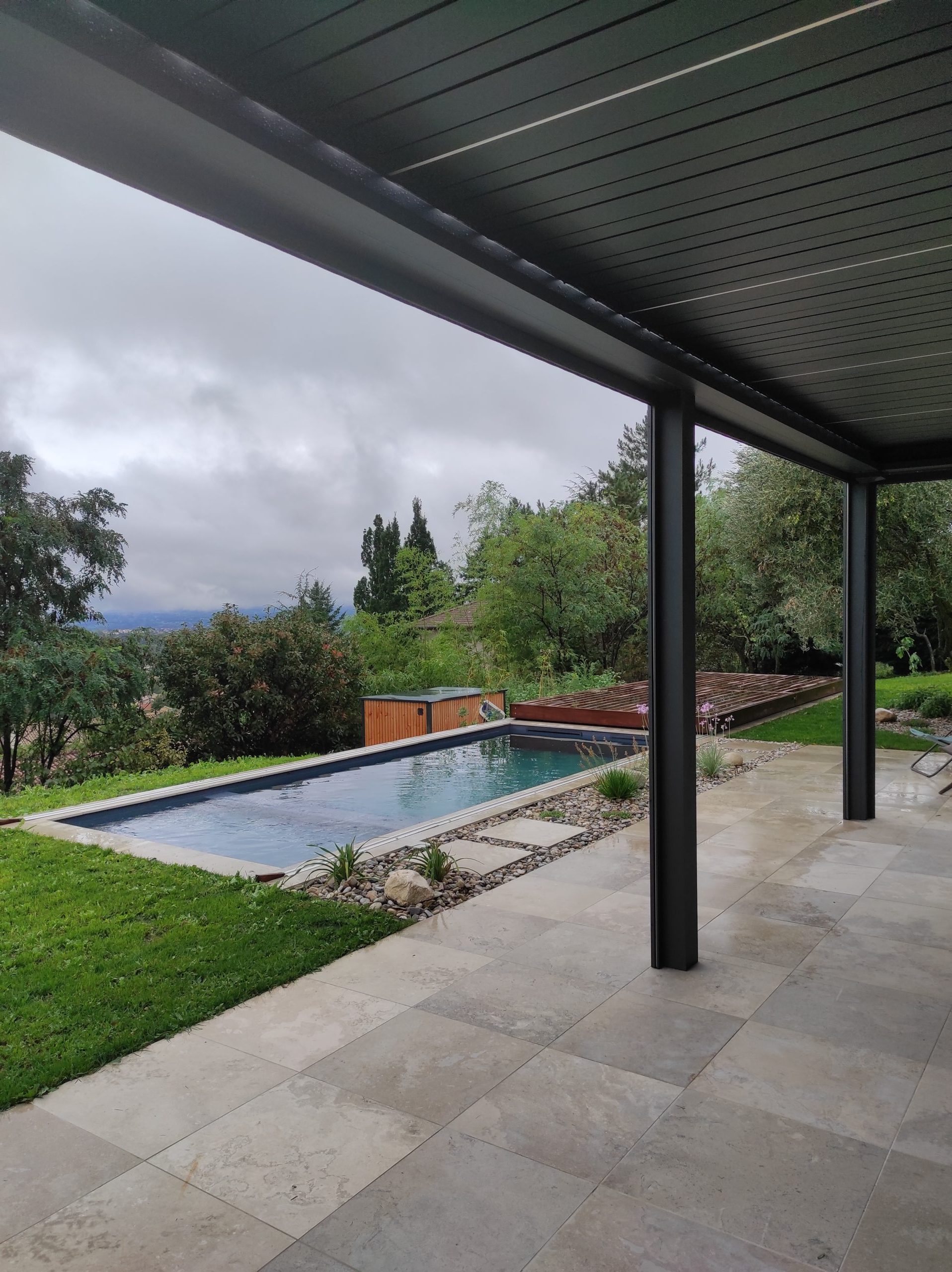 Het terras, dat schaduw krijgt van een bioklimatologische pergola, komt uit op een zwembad dat qua afmetingen perfect is afgestemd op het gezinsleven en de landschappelijke omgeving.