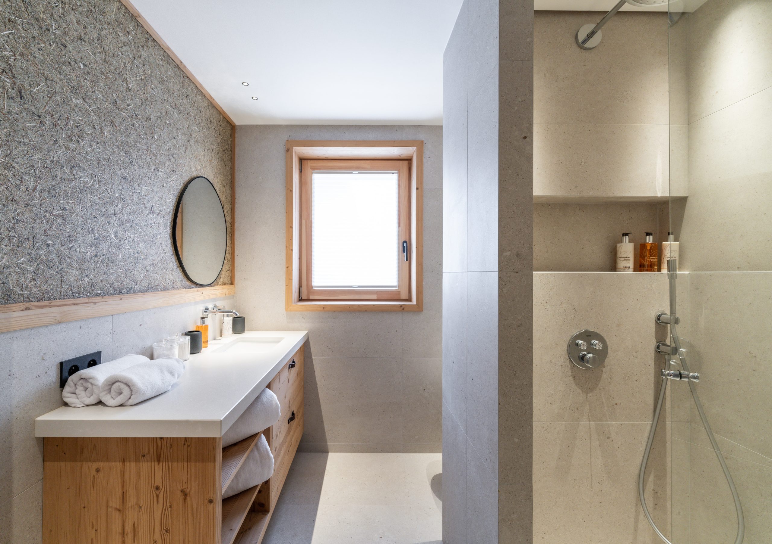 Het interieur biedt een warme en eigentijdse sfeer, waar hout, steen en natuurlijke materialen de leefruimtes en badkamers structureren. In sommige badkamers is gekozen voor de collectie Otto van Novoceram voor de vloeren en wanden. De sobere minerale esthetiek past natuurlijk in de sfeer van het project en voldoet tegelijkertijd aan de technische eisen van een luxe accommodatie.