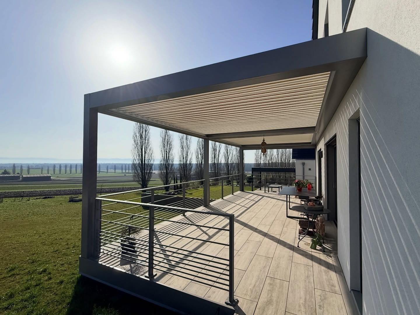De eigenaren kozen voor tegels met houteffect voor het terras. Deze bekleding zorgt voor een natuurlijke zachtheid die perfect contrasteert met het antracietgrijze schrijnwerk en de bioklimatische pergola.