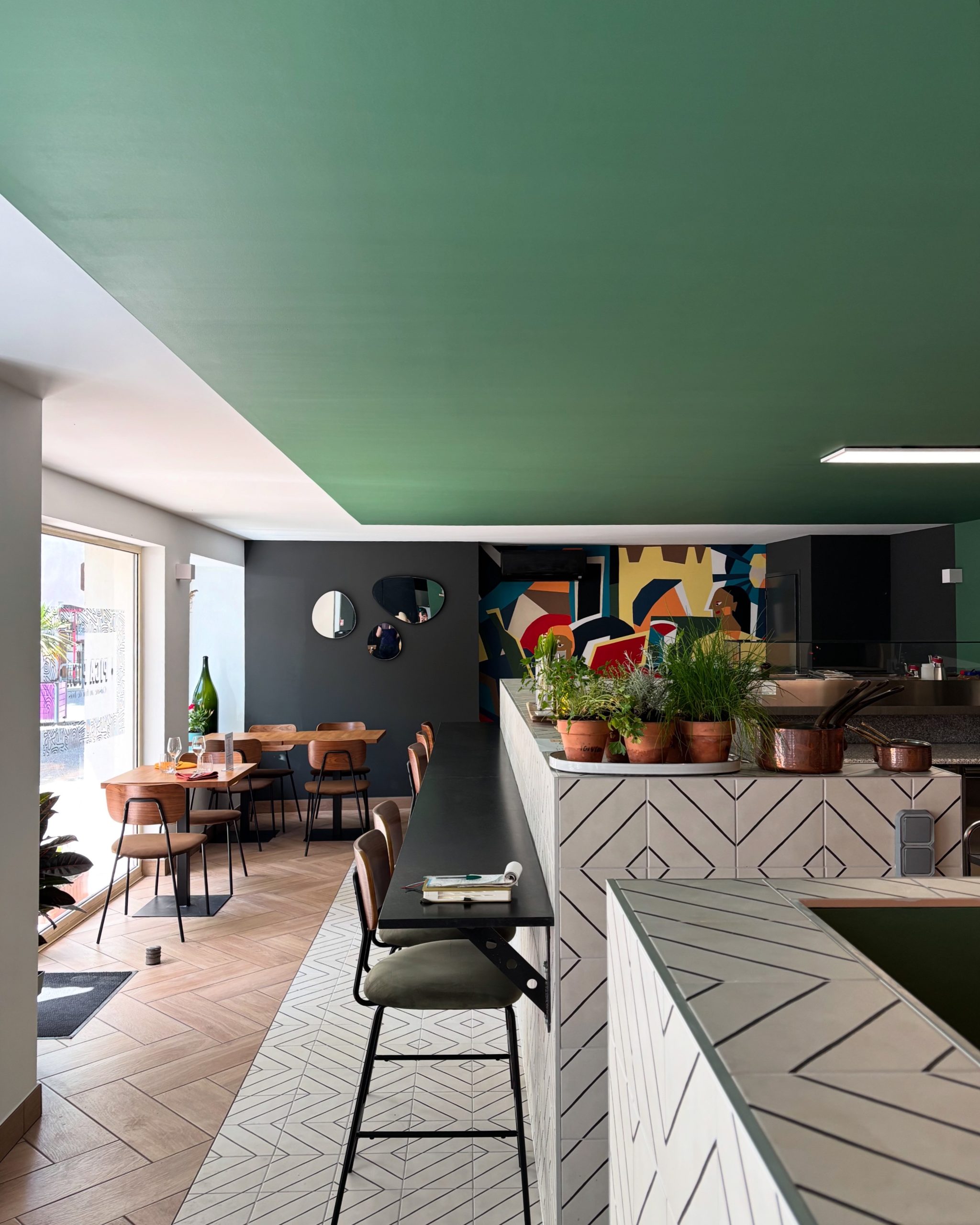 De Bohème-collectie van Novoceram werd gebruikt op een deel van de vloer en op de oppervlakken van de bar en de keuken. De decoratieve esthetiek, geïnspireerd op cementtegels, zorgt voor ritme in de ruimtes en creëert afgebakende zones binnen het restaurant.