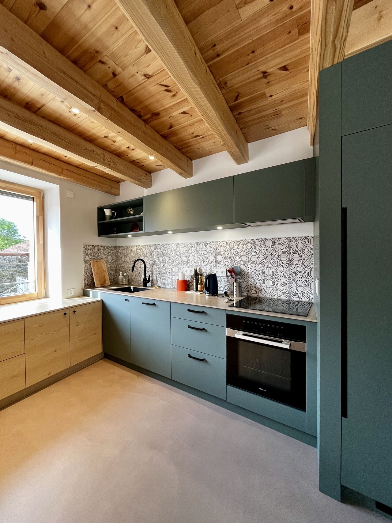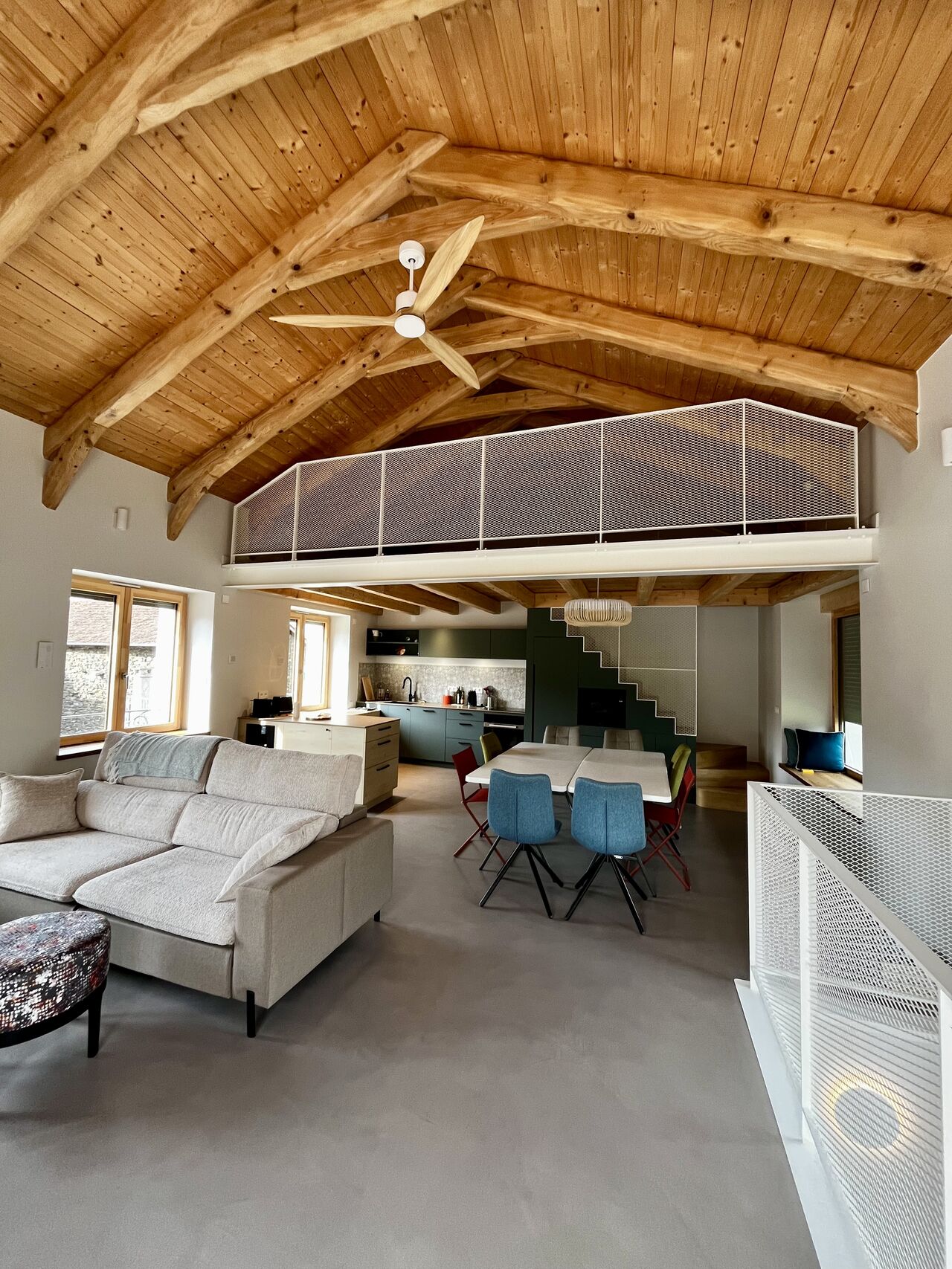 De kleurrijke meubels gaan harmonieus samen met het natuurlijke hout en de zichtbare balken, waardoor een subtiel evenwicht ontstaat tussen traditie en moderniteit.