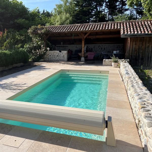 Het zwembadterras is volledig gerenoveerd met de collectie Tiber, waarvan de op travertijn geïnspireerde tinten harmonieus aansluiten bij de aangrenzende stenen muur.